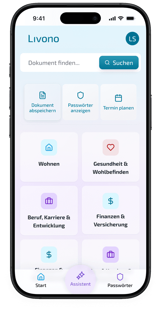 Livono bringt Struktur in dein Privatleben – mit 14 übergeordneten Lebensbereichen wie Finanzen, Gesundheit, Familie oder Freizeit. Jeder Bereich enthält thematisch geordnete Unterordner, in denen du wichtige Dokumente, Informationen und Checklisten einfach ablegen, verwalten und wiederfinden kannst. Unterstützt von KI, flexibel anpassbar und sicher gespeichert – so gewinnst du Zeit, behältst den Überblick und genießt mehr echte Freizeit.