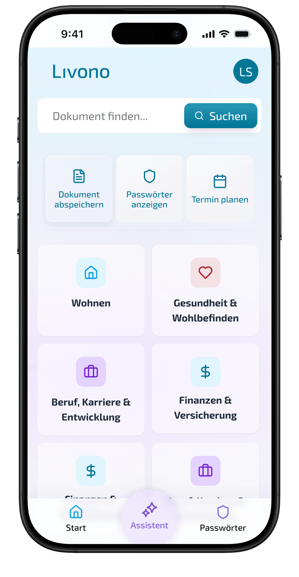 livono bringt Klarheit in dein Leben. Es strukturiert komplexe Lebensbereiche und unterstützt bei Organisation, Planung und Absicherung: